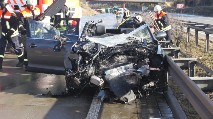 Ein PKW Audi war nahezu ungebremst unter einen Lastzug gekracht und dessen Fahrer wurde eingeklemmt. Offenbar hatte der Fahrer den langsam am Bergaufstück fahrenden Lastzug zu spät erkannt. Zunächst kam es zu einer problematischen Gestaltung der Anfahrt. Beamte der Autobahnpolizei mussten viel Zeit aufwenden, um überhaupt ansatzweise eine Rettungsgasse für die Einsatzfahrzeuge von DRK und Feuerwehr bilden zu können.