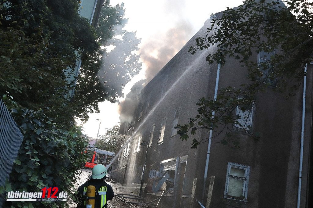 Die Feuerwehren aus Gotha waren mit einem Großaufgebot vor Ort. Die Flammen hatten sich sehr schnell auf das gesamte Objekt ausgebreitet.