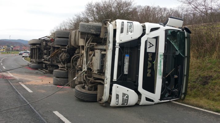 Dabei verlor er die Kontrolle über sein Fahrzeug. Der Sattelzug geriet auf die Gegenfahrbahn, kippte um und blieb auf der Fahrerseite liegen.