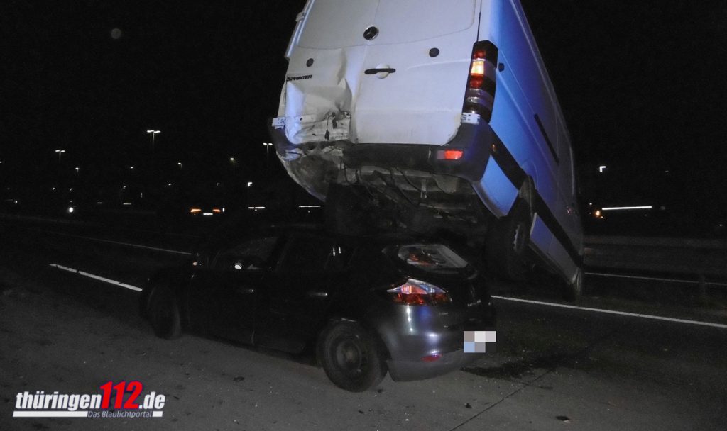 Durch die Wucht des Aufpralls schob sich der PKW unter den Kleintransporter, der dadurch anschließend quer auf dem PKW zum Stehen kam.