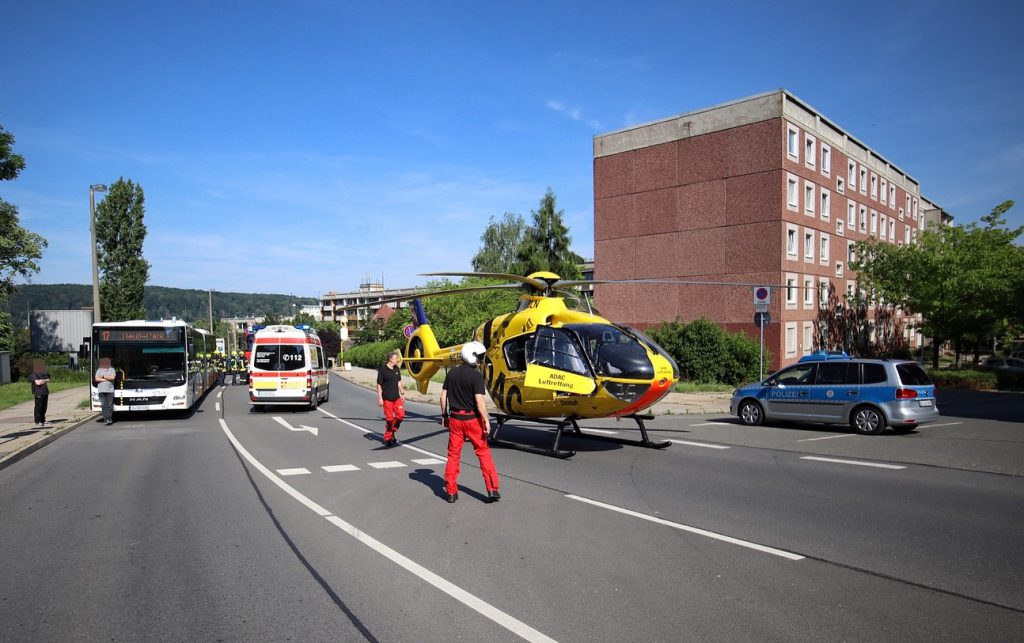 Die Kräfte der Berufsfeuerwehr Gera und der Freiwillige Feuerwehr Gera-Mitte sicherten die Landezone des Hubschraubers ab, stellten den Brandschutz sicher und reinigten die Fahrbahn.