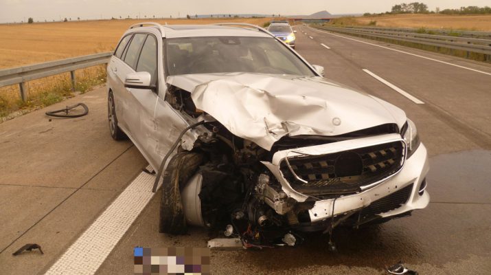 Der Mercedes schleuderte über die Fahrbahn und stieß dabei noch gegen das Fahrzeuggespann. Anschließend prallte der Mercedes in die Mittelschutzplanke. Verletzt wurde bei dem Unfall niemand.